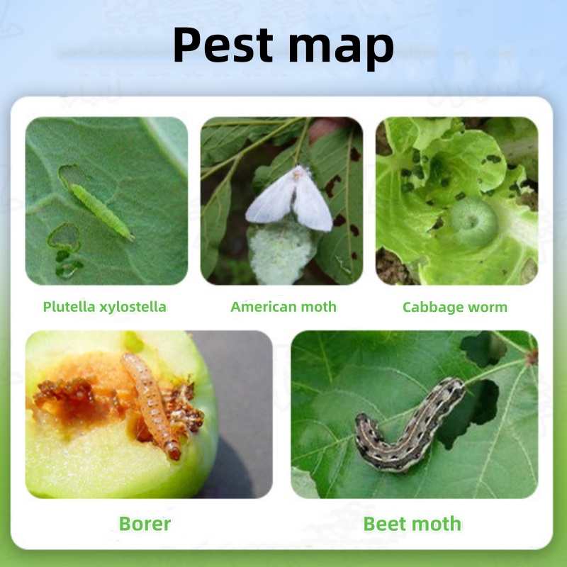 It is highly effective against various lepidopteran pests, such as peach tree leafminer, tea black moth, tea eelworm, cabbage caterpillar, rape night moth, wheat stickworm, corn borer, American white moth, pine caterpillar, dancing moth, boat moth, and treetop moth.
